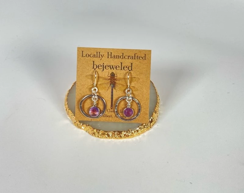 Handmade with care, these earrings are adorned with Amethyst crystals & hand hammered sterling silver. One of a kind!
