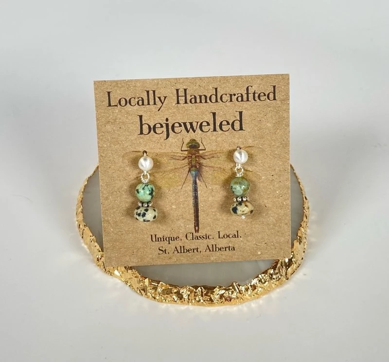 Handmade with care, the Dalmatian Jasper is incredible with animal print! The matte turquoise bead makes these easy to pair with denim as well.