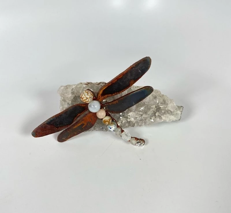 Dragonflies are proudly made from upcycled metals in Canada and adorned with semi precious stones and Swarovski Crystal