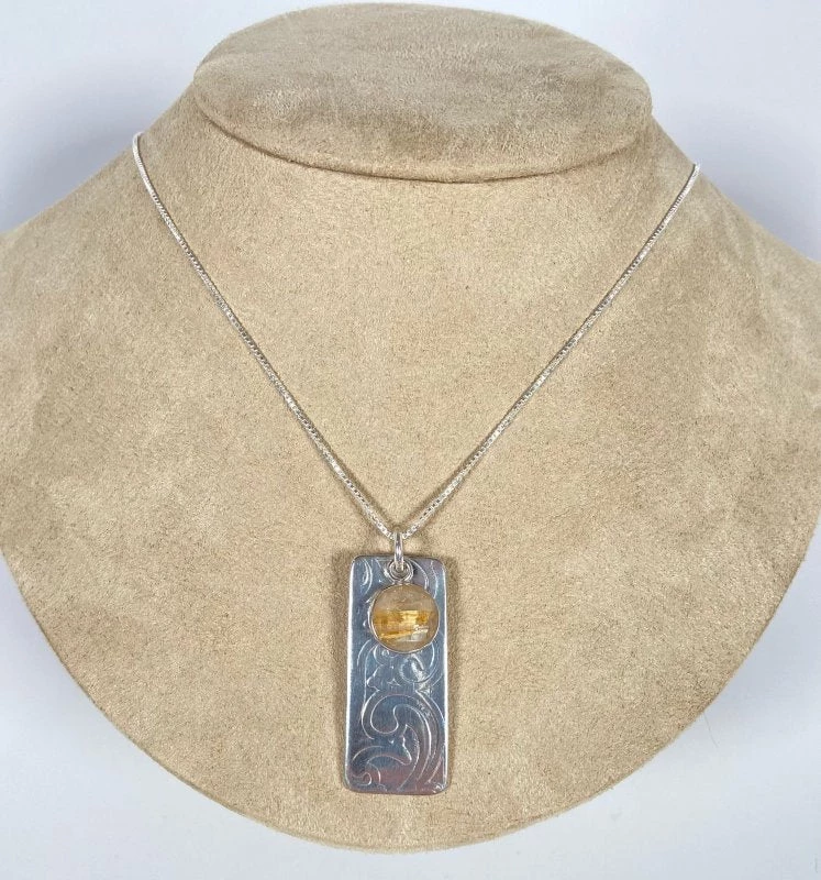Handcrafted in Alberta and one of a kind – sterling silver is imprinted with a Damask pattern and is adorned with a gold colored rutilated quartz crystal.