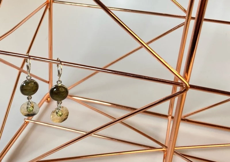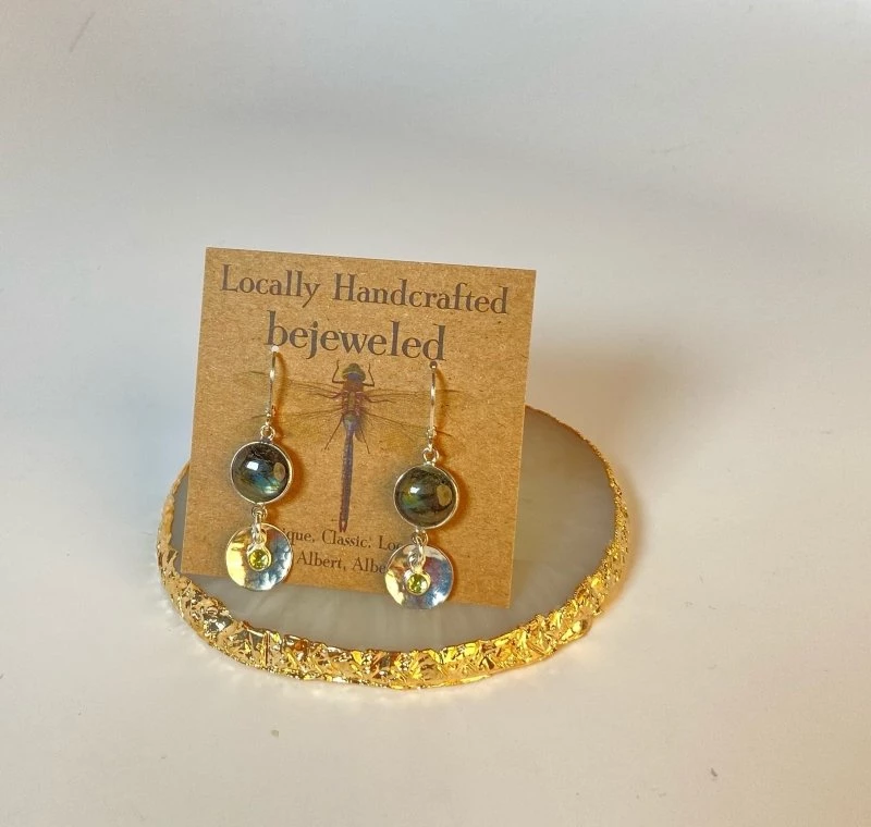 Handmade with care, these hand hammered sterling silver, Labradorite and Peridot earrings are one of a kind!
