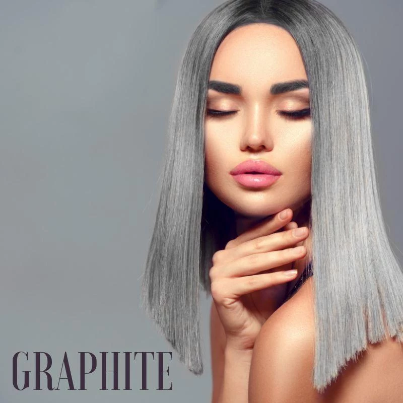 A steel Grey with cool blue indigo undertones – Graphite is the unicorn when it comes to unique colors. Suited towards clients with mature greying hair or young and funky icy silver hair. Or just when you find your browns and blondes don’t suit the skin tone any longer, Graphite holds a unique undertone that our other pigments do not.