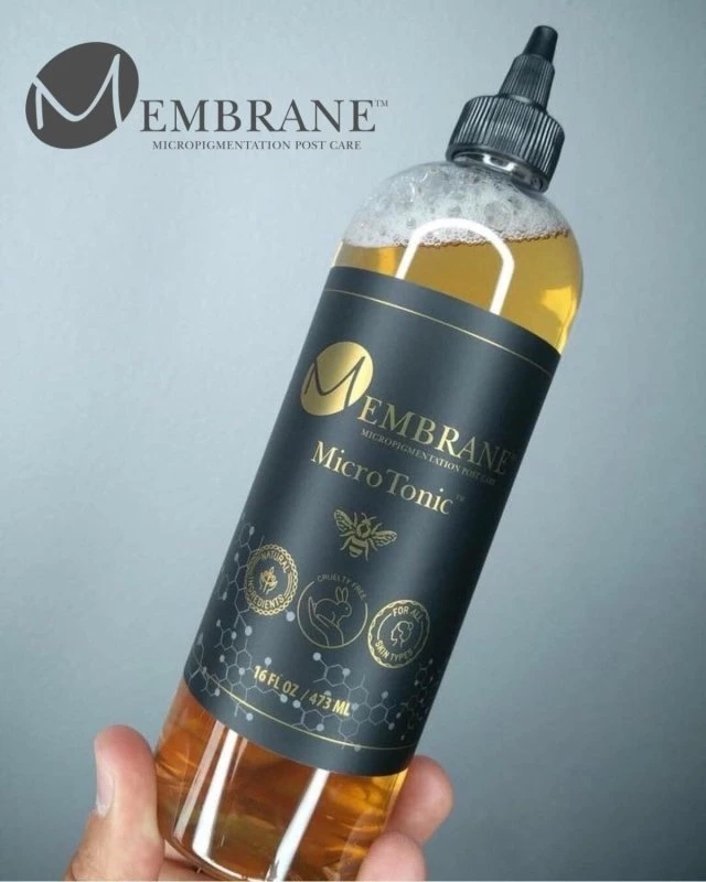 Membrane MicroTonic is a pure golden elixir that has an outstanding number of properties for skin art and rejuvenation treatments, as well as for everyday use. A true liquid gold, MicroTonic expedites the healing process of all manner of dermal wounds, reduces inflammation, suppresses nerve pain, eliminates lymph, and soothes tissue. All of these together serve to help lock in pigment and yield excellent retention. The science behind how MicroTonic works is simple —it reduces the body’s immune response to the wound, closes pores, nourishes tissue and provides essential hydration necessary for expeditious healing.