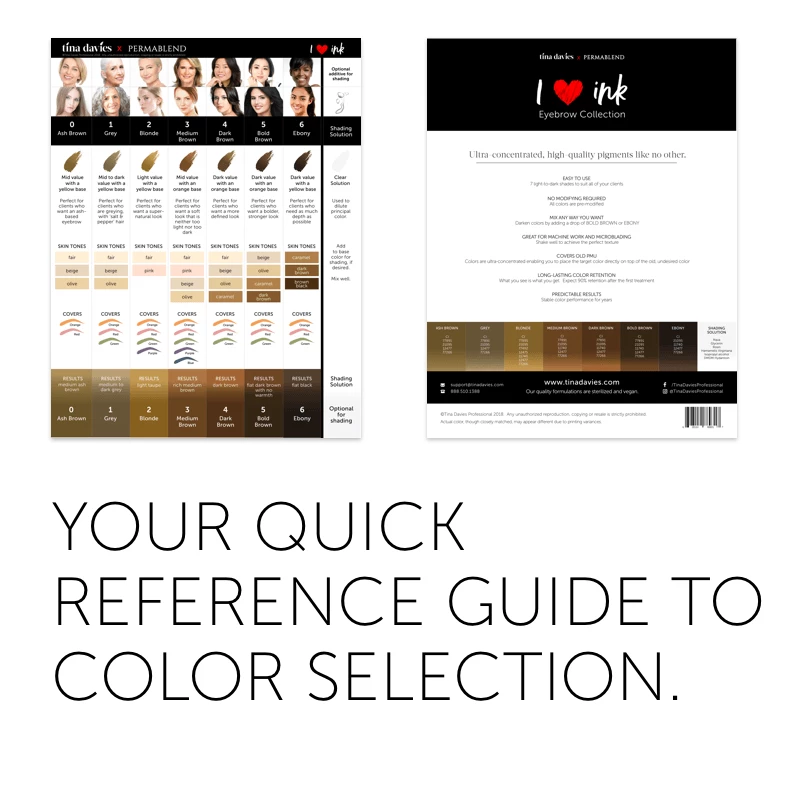 The first of its kind, the Tina Davies Eyebrow Collection Colour Chart was designed with the artist in mind, to be used as a quick reference guide to take the guesswork out of choosing the right I ❤️ Ink Collection pigment shade for your client.